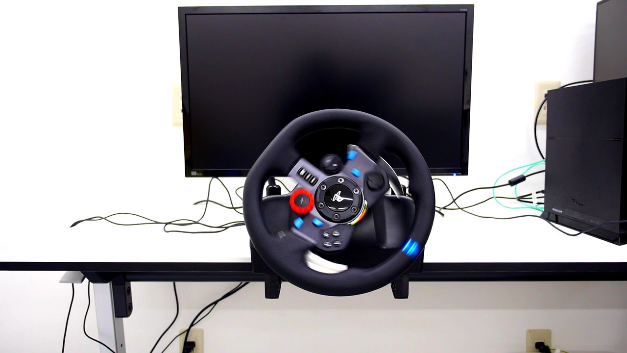 USB端子をPS4に挿し、電源用のプラグをコンセントに挿しこんだ後ステアリングを机に固定すれば準備完了。PS4の電源を入れるとステアリングコントローラーの自動調整が始まり、勝手にグルグルとステアリングホイールが回転します。