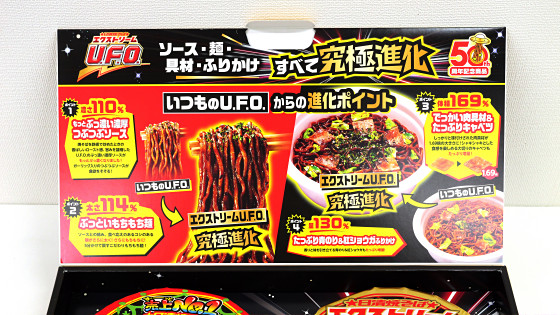 日清焼そばU.F.O.の発売50周年を記念してソース・麺・具材・ふりかけを「究極進化」させた「日清焼そばエクストリームU.F.O.」が2026年3月2日に登場しました。通常のU.F.O.と比べて「ソースの濃さが約110%にアップ」「麺の太さが約114%にアップ」「肉具材の体積が約169%にアップ」「ふりかけの量が約130%にアップ」という豪華仕様とのこと。通常版U.F.O.とエクストリームU.F.O.を比べられるセットがGIGAZINE編集部に届いたので、実際に食べて比べてどれだけエクストリームなのか確かめてみました。