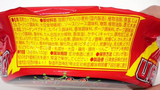 エクストリームU.F.O.のソースの材料は糖類、ソース調味料、還元水あめ、食塩、植物油脂、しょうゆ、香辛料、スパイス調味料、香味調味料、ポーク調味料、ポーク調味油、たん白加水分解物、香味油、ガーリック調味料という順番。原材料は含有量の多い順に書かれるので、いつものU.F.O.とエクストリームU.F.O.のソースはかなり異なる配合になっていることが分かります。