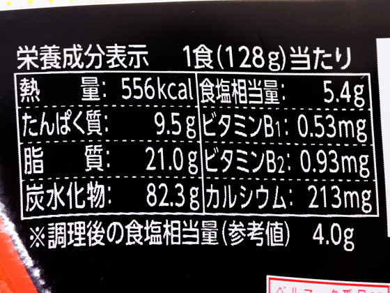 いつものU.F.O.のカロリーは1食当たり556kcalで、調理後の食塩相当量は4.0g。