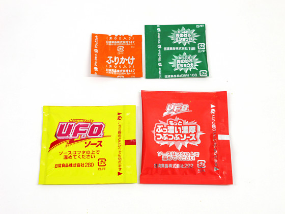 ふりかけとソースを並べてみました。左がいつものU.F.O.で、右がエクストリームU.F.O.です。エクストリームU.F.O.のふりかけの方が明らかに大きいです。