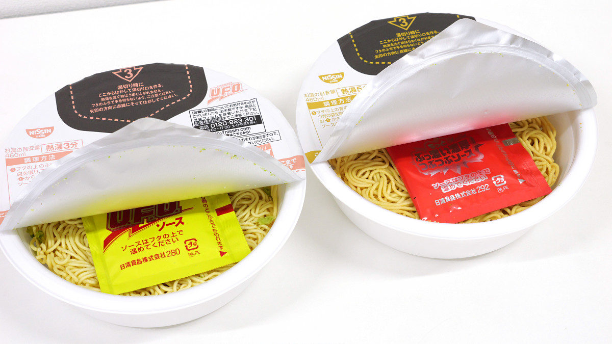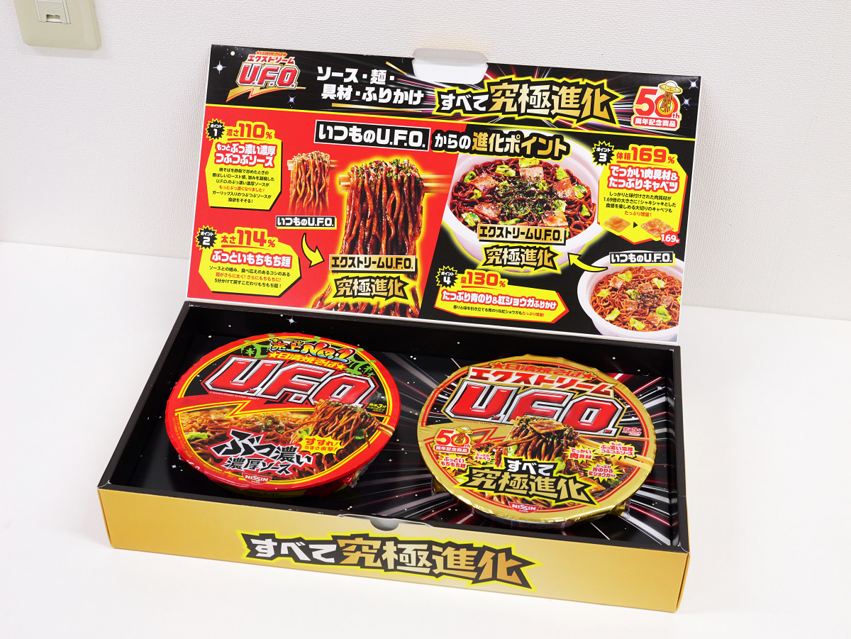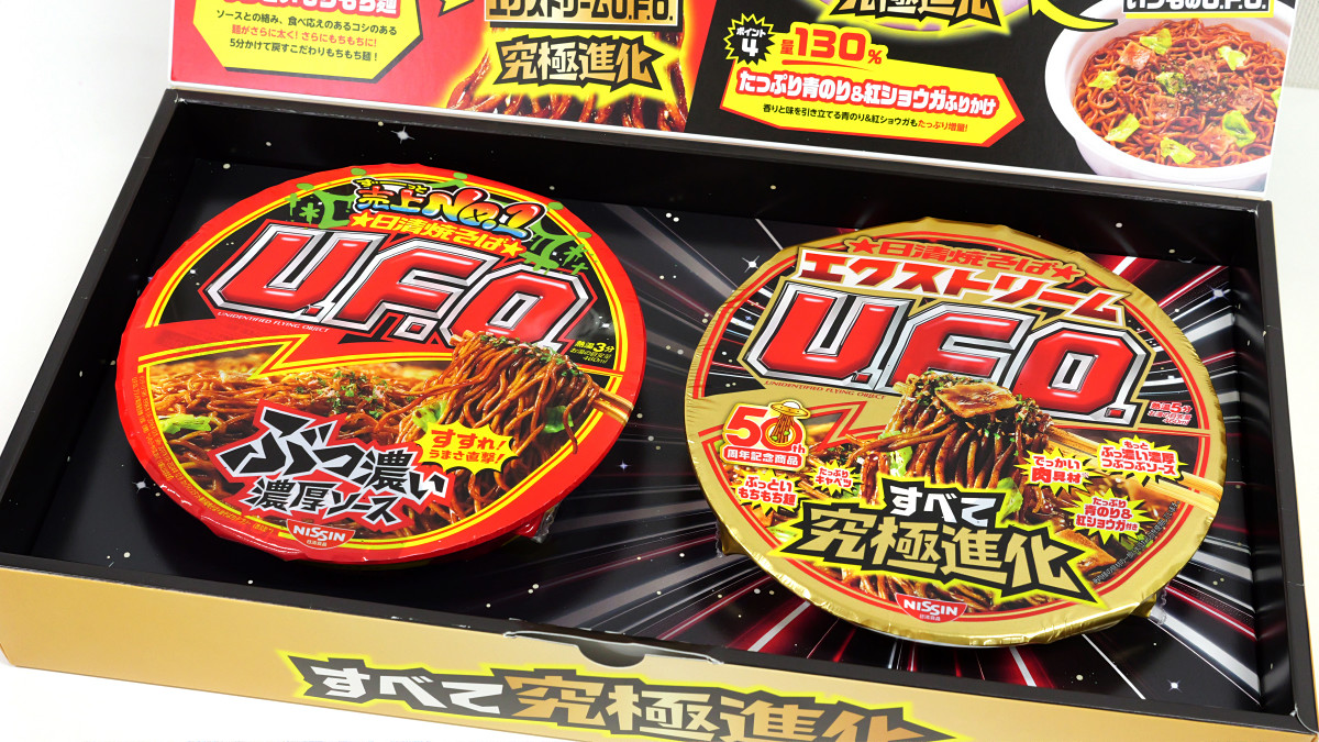 日清焼そばU.F.O.の発売50周年を記念してソース・麺・具材・ふりかけを「究極進化」させた「日清焼そばエクストリームU.F.O.」が2026年3月2日に登場しました。通常のU.F.O.と比べて「ソースの濃さが約110%にアップ」「麺の太さが約114%にアップ」「肉具材の体積が約169%にアップ」「ふりかけの量が約130%にアップ」という豪華仕様とのこと。通常版U.F.O.とエクストリームU.F.O.を比べられるセットがGIGAZINE編集部に届いたので、実際に食べて比べてどれだけエクストリームなのか確かめてみました。