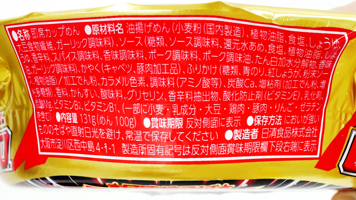 エクストリームU.F.O.のソースの材料は糖類、ソース調味料、還元水あめ、食塩、植物油脂、しょうゆ、香辛料、スパイス調味料、香味調味料、ポーク調味料、ポーク調味油、たん白加水分解物、香味油、ガーリック調味料という順番。原材料は含有量の多い順に書かれるので、いつものU.F.O.とエクストリームU.F.O.のソースはかなり異なる配合になっていることが分かります。