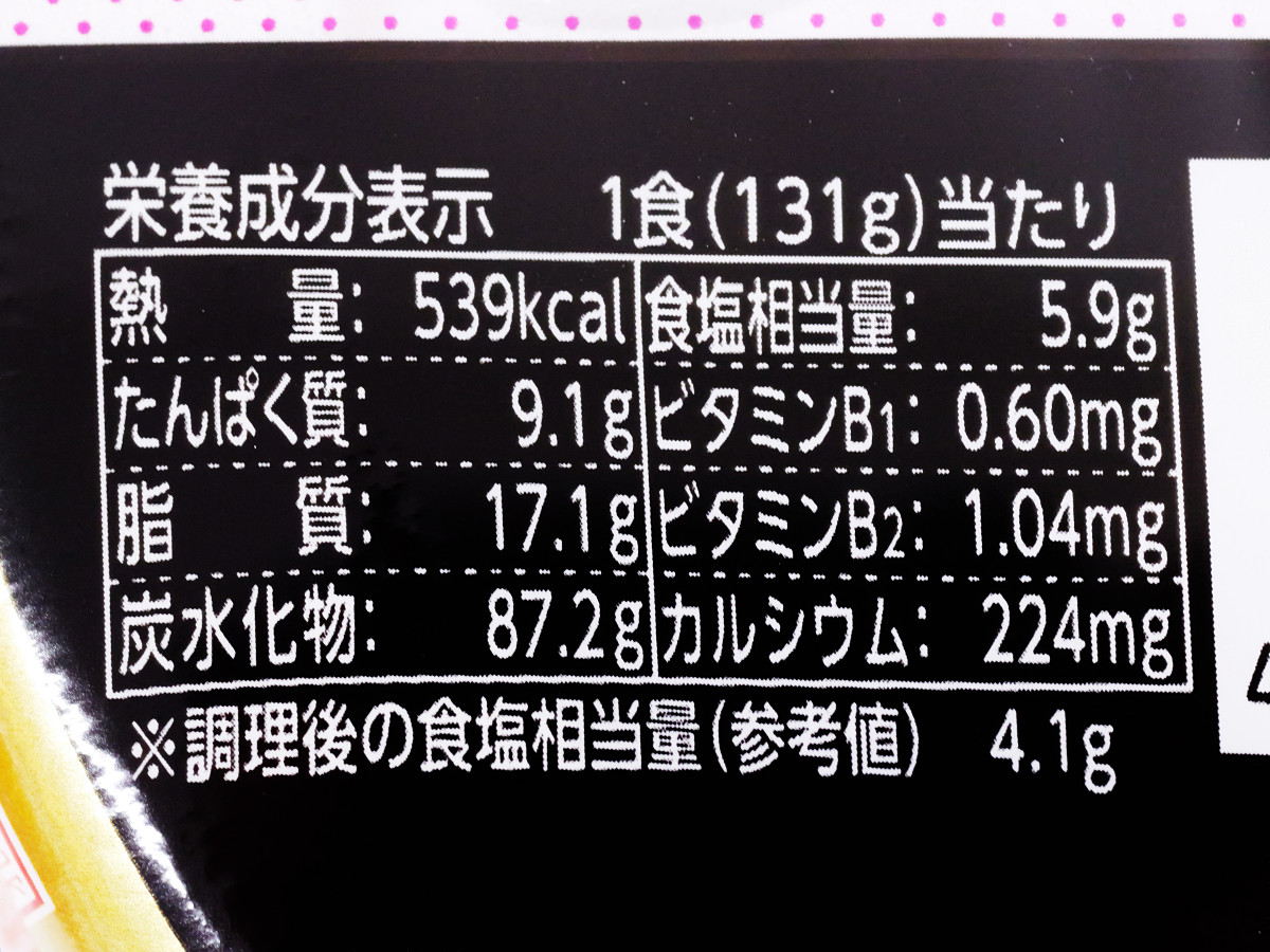 エクストリームU.F.O.はカロリーが539kcalへと下がっています。調理後の食塩相当量は0.1g増えて4.1gです。
