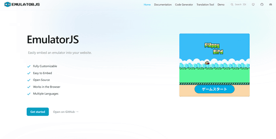 EmulatorJSの大きな特徴が導入のしやすさで、わずか数行のコードを記述するだけでエミュレータをサイト内に設置できるとのこと。埋め込み用のコードを自動的に生成してくれる専用のエディタも提供されているため、プログラミングに詳しくない利用者でも扱いやすい設計となっています。また、多言語表示に対応しており、外観や機能についても組み込みのオプションを使って詳細にカスタマイズすることが可能です。