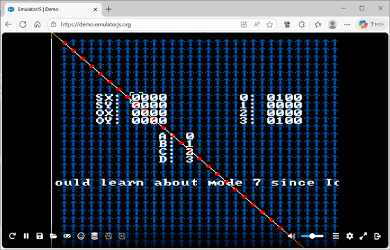 以下は実際にEmulatorJSで、パブリックドメインとして公開されているSNES用デモのROM「Mode 7 Interactive Demo」を動作させているところ。