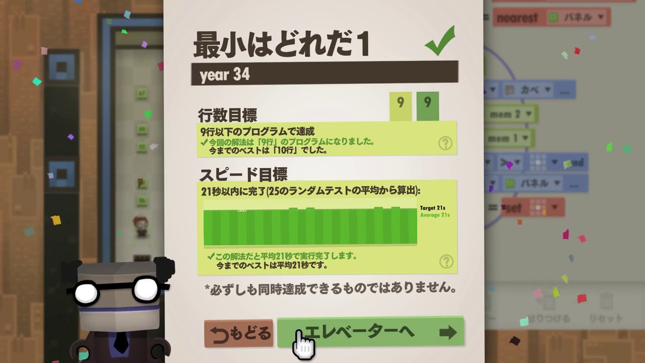 以下の34年目のステージ「最小はどれだ」は、4人の社員の上にずらりと並ぶパネルの中から、最も小さい数のパネルだけをシュレッダーにかけるという仕事です。このステージのポイントは「最も小さい数を4人の社員に選ばせる」というところ。もちろん社員は勝手に判断はできないので、プレイヤーが最小の数を判断できるようなプログラムを組む必要があります。