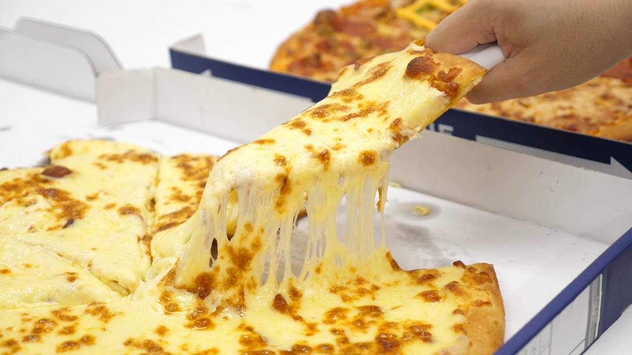 「チーズの海」という言葉がふさわしいピザの様子は、以下のムービーを見るとよくわかります。