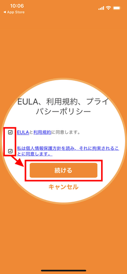 EULA、利用規約、プライバシーポリシーに同意するため、2つのチェックを入れて、「続ける」をタップします。