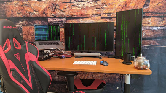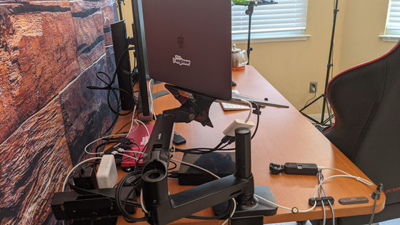 椅子はゲーミングチェアの「DXRACER」ですね。机は高さを変えられるものにしていて、ラップトップPCもアームに付けて動かせるようにしています。そうすると、Zoomをやるときはラップトップを正面にして、やらないときは端に置いておいたりできて便利です。