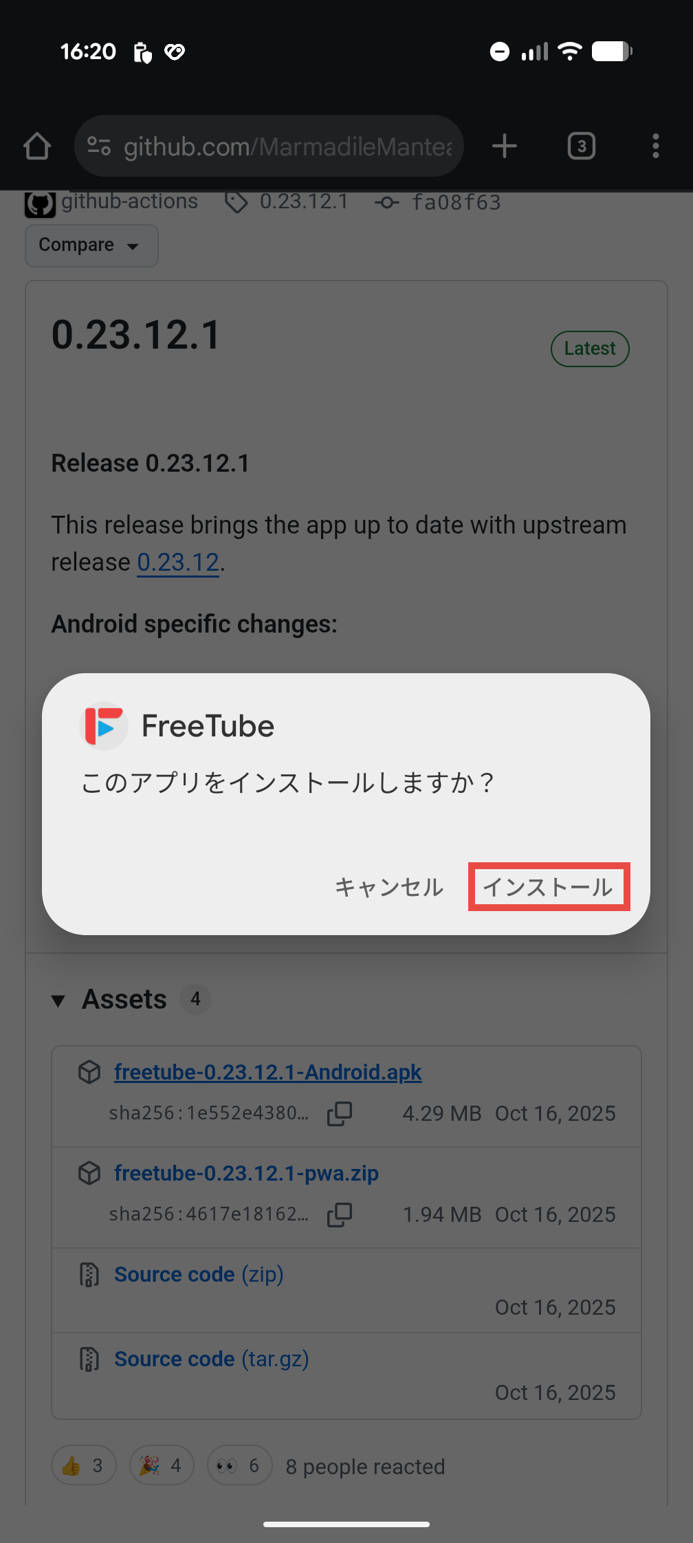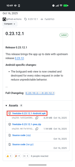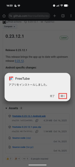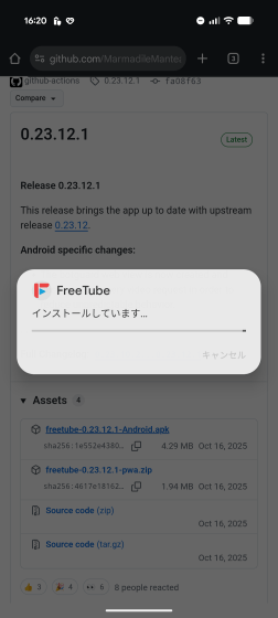 つまりまだ不具合が残っている状況でありインストールは自己責任で行うということになります。問題がなければGitHubのリリースページから最新のapkファイルをダウンロードします。記事作成時点では最新バージョンは0.23.12.1なのでダウンロードするファイルは「freetube-0.23.12.1-Android.apk」です。