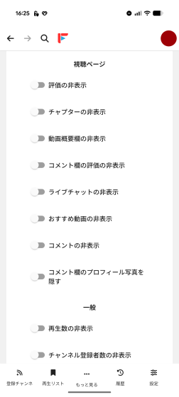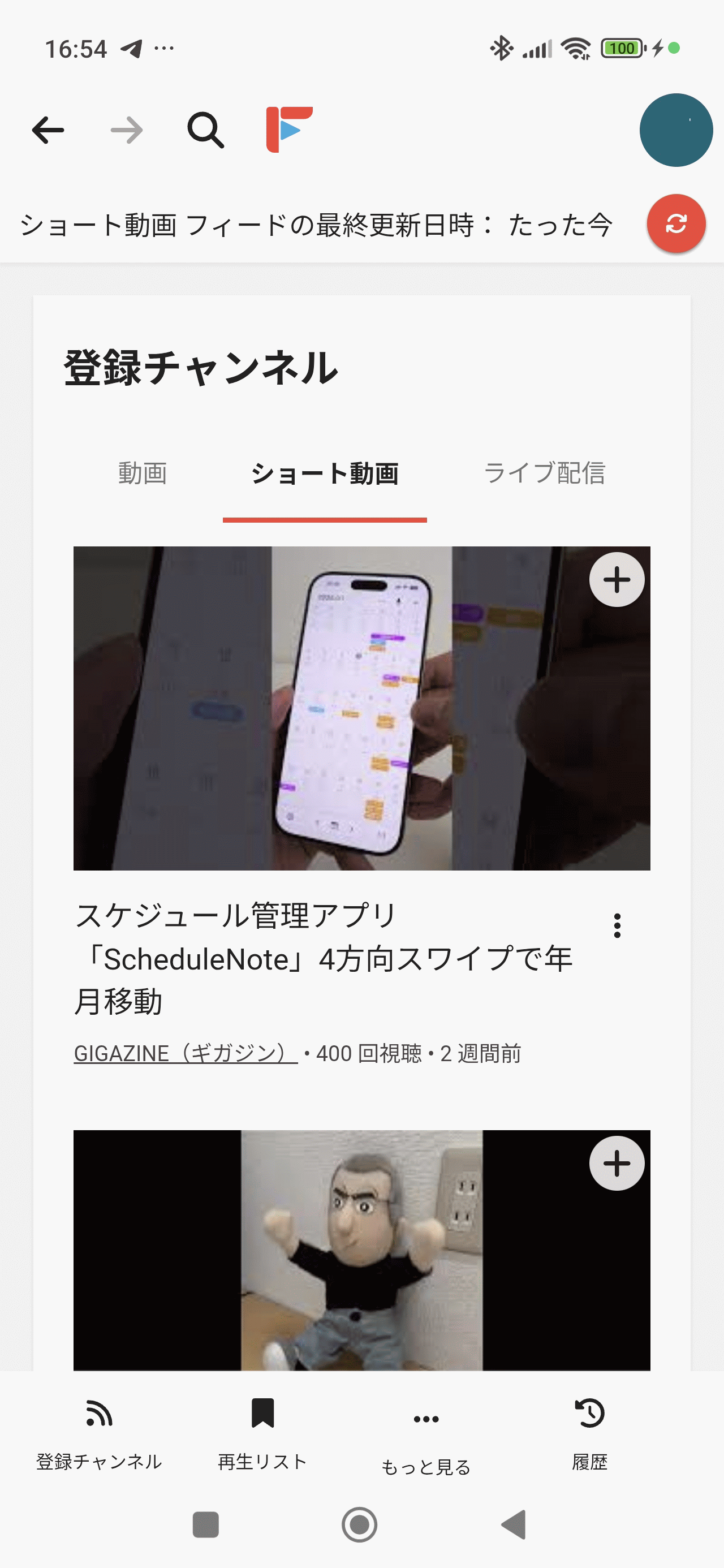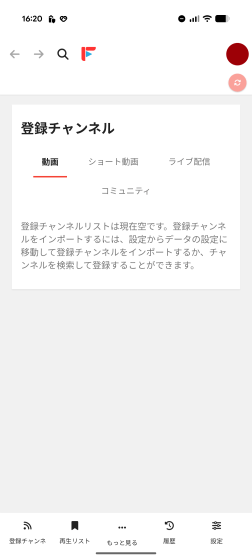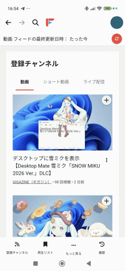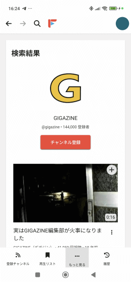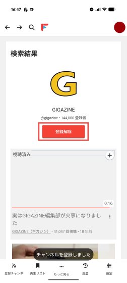 画面下部のメニューから「登録チャンネル」を選択すると、登録したGIGAZINEチャンネルが表示されました。「動画」タブにはGIGAZINEチャンネルに登録された動画が一覧で表示されています。