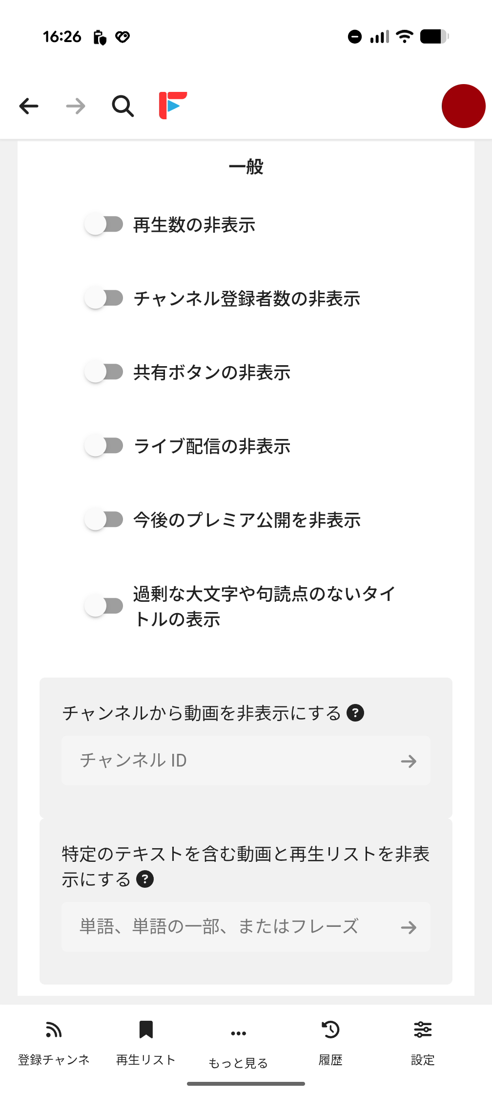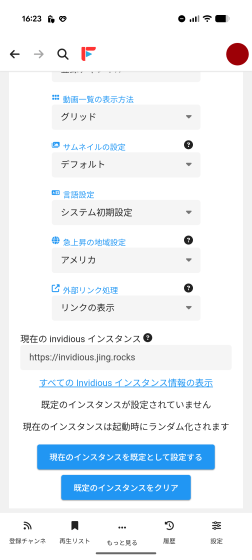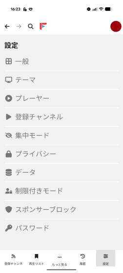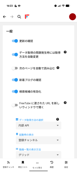 「一般」の設定項目。「データ取得方式の選択」は「内部 API」と匿名性を重視した「Invidious API」から選択可能です