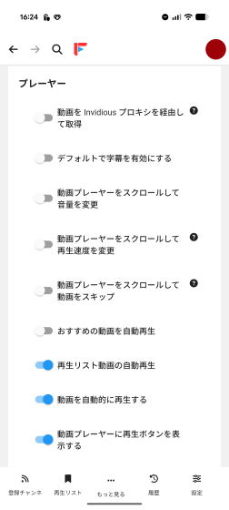 「プレイヤー」の設定項目は動作に関するものが中心です。