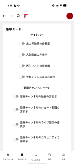 「集中モード」ではいろいろなUIを非表示して動画に集中できるようになります。例えば「急上昇動画」「人気動画」「再生リスト」「登録チャンネル」「ショート動画」「ライブ配信」「コミュニティ」などを消すことができるので、「チャンネルのライブには興味が無い、動画だけ見たい」という場合に役立ちます。