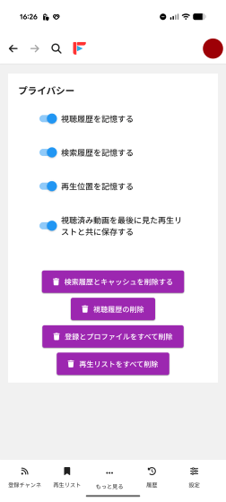 「プライバシー」の設定項目。利用した痕跡をスマホに残すかどうかの切り替えと、キャッシュや履歴などを削除するボタンが配置されています。利用者のプライバシー保護を重視している開発姿勢が伝わってきます。