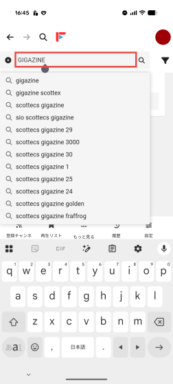 視聴する動画を見つけるために検索バーを使ってみることにします。試しに「GIGAZINE」と入力してみたところ候補が表示されます。
