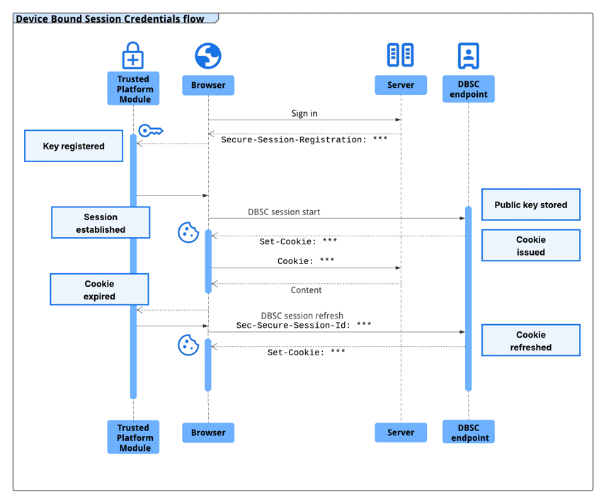 DBSCは有効期間の短いCookieとハードウェア格納型キーペアを使用して認証セッションをデバイスにバインドさせ、ブラウザは定期的に秘密鍵の所有を証明しセッション Cookieを更新します。DBSCの大まかなフローは以下の通りです。