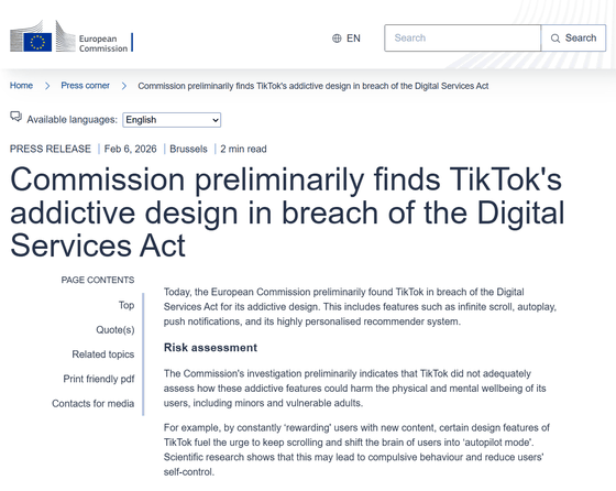 EUの政策執行機関である欧州委員会(EC)が、「TikTokの中毒性のあるデザインがデジタルサービス法(DSA)に違反している」という暫定的な判断を下しました。