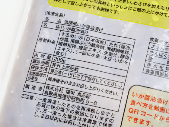 原材料名には「するめいか」と「たれ」の文字。たれには醤油・砂糖・果糖ぶどう糖液糖・発酵調味料・鰹節粗砕・鰹節エキス・生姜汁などが入っています。