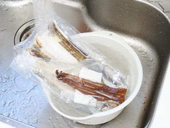 まずは流水解凍していきます。焼く前は半解凍状態にしておくとのことですが、気温が高い時期だったので6分程度で半解凍状態にできました。