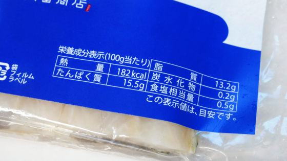 伝説のしめ鯖は青森県八戸市で水揚げされた、脂ののった鯖を使用。原材料名は鯖・酢・塩のみで、カロリーは100gあたり282kcalです。