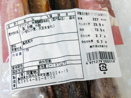 またあなごの蒲焼きは原材料名に米発酵調味料・醤油・酒・砂糖・水飴が並んでいます。カロリーは100gあたり227kcalです。
