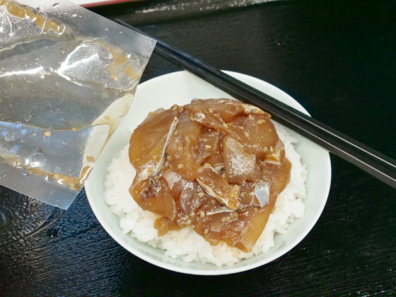 するめいかは全く硬さがなく、柔らかくとろりとしています。醤油と砂糖の甘辛い味付けは「ザ・ご飯に合う味」ですが、食べていると後半はするめいか本来の甘さが感じられました。