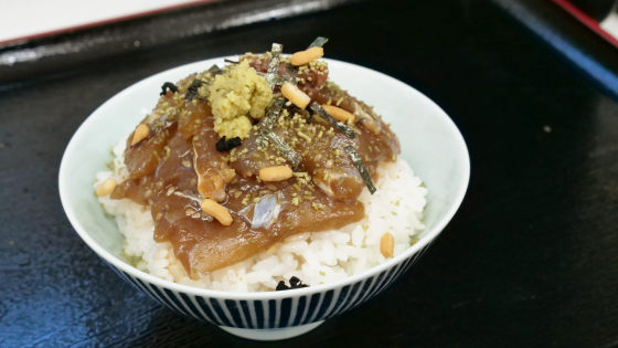 伝説のしめ鯖・あなご一夜干・あなごの蒲焼きと、「素材の味を楽しむ」タイプの品が続きましたが、この鯛茶漬けは長崎県壱岐島の漁港で獲れた真鯛を平山旅館の独自調合のタレで漬けており、「料理としての味」を楽しむもの。平山旅館で夜食として人気があったとのことですが、確かに甘辛いしっかりした味付けと、梅干しの酸味、サラッと食べられるお茶漬けは夕食後、夜の小腹がすいたタイミングで食べたくなる味です。