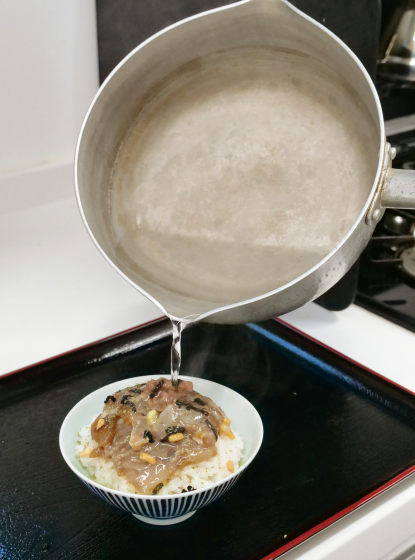お湯を注ぐと部分的に鯛漬けの色が変化し、生の部分とミディアムレアっぽい部分が生まれました。