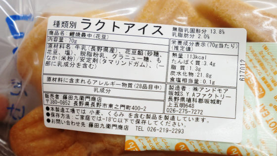 鯉焼きアイス最中は信州特産の高原花豆を使ったアイス最中で、原材料名には牛乳・花豆餡・脱脂粉乳・グラニュー糖など。カロリーは1個70gあたり113kcalです。