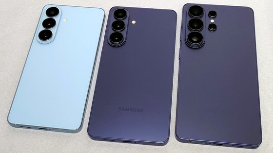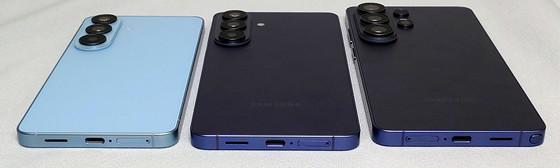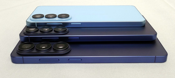3機種を背面向けで並べてみました。左からスカイブルーのS26、コバルトバイオレットのS26+、コバルトバイオレットのS26 Ultraです。S26+とS26 Ultraはちょっと異なる色のように見えていますが、光の加減などによるもので同色です。寸法はそれぞれ149.6mm×71.7mm×7.2mm、158.4mm×75.8mm×7.3mm、163.6mm×78.1mm×7.9mm。カメラレンズはS26とS26+が3つ、S26 Ultraが4つ搭載です。