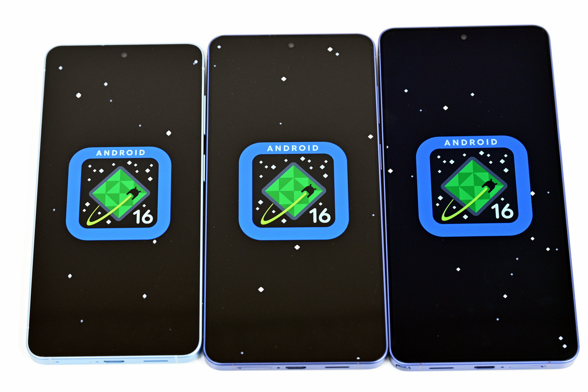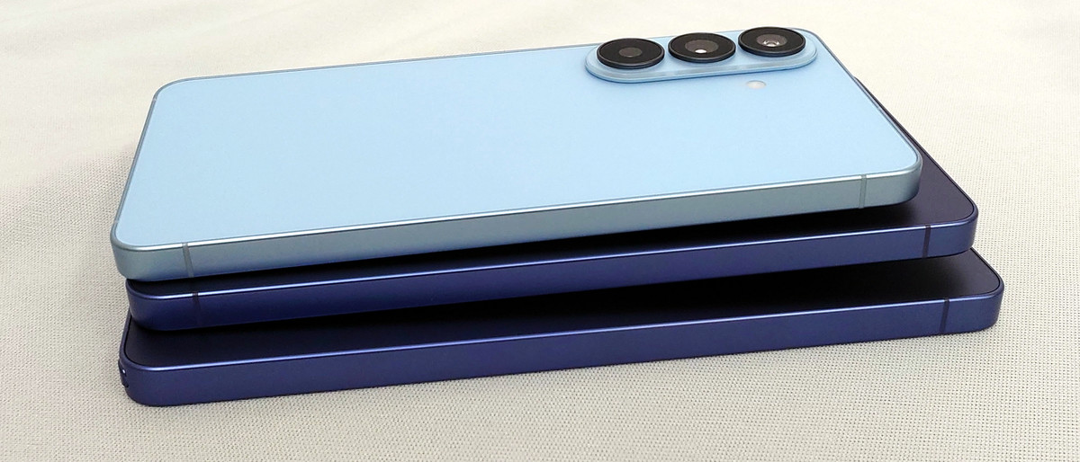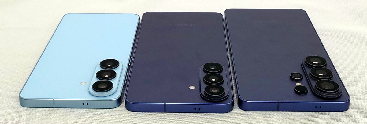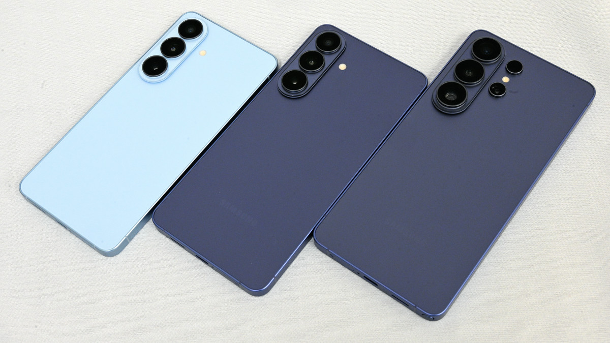 3機種を背面向けで並べてみました。左からスカイブルーのS26、コバルトバイオレットのS26+、コバルトバイオレットのS26 Ultraです。S26+とS26 Ultraはちょっと異なる色のように見えていますが、光の加減などによるもので同色です。寸法はそれぞれ149.6mm×71.7mm×7.2mm、158.4mm×75.8mm×7.3mm、163.6mm×78.1mm×7.9mm。カメラレンズはS26とS26+が3つ、S26 Ultraが4つ搭載です。