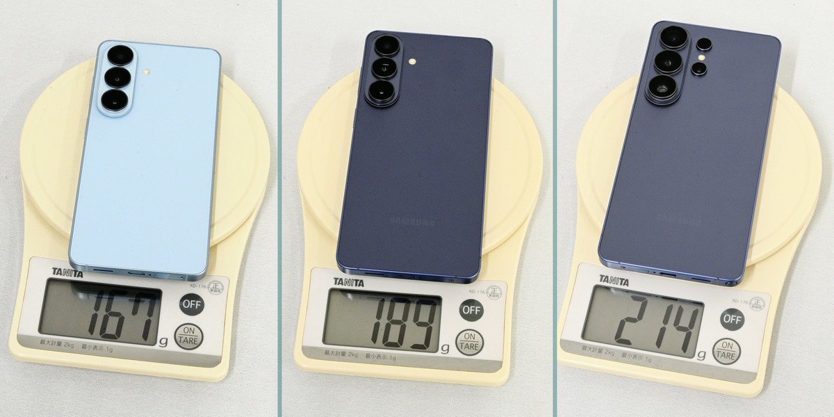 重さを実測したところ、S26が167g、S26+が189g、S26 Ultraが214gでした。