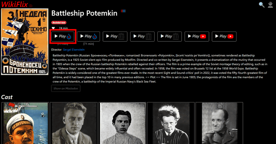 WikiFlixにアクセスするとこんな感じで、ウィキメディア・コモンズ、インターネット・アーカイブ、YouTubeにパブリックドメインとして公開されている映画のタイトルとサムネイルが並んでいます。今回は「Highly Ranked(# Wikipedia Article)」の欄に表示されていた「Battleship Potemkin(戦艦ポチョムキン)」のサムネイルをクリックしてみました。