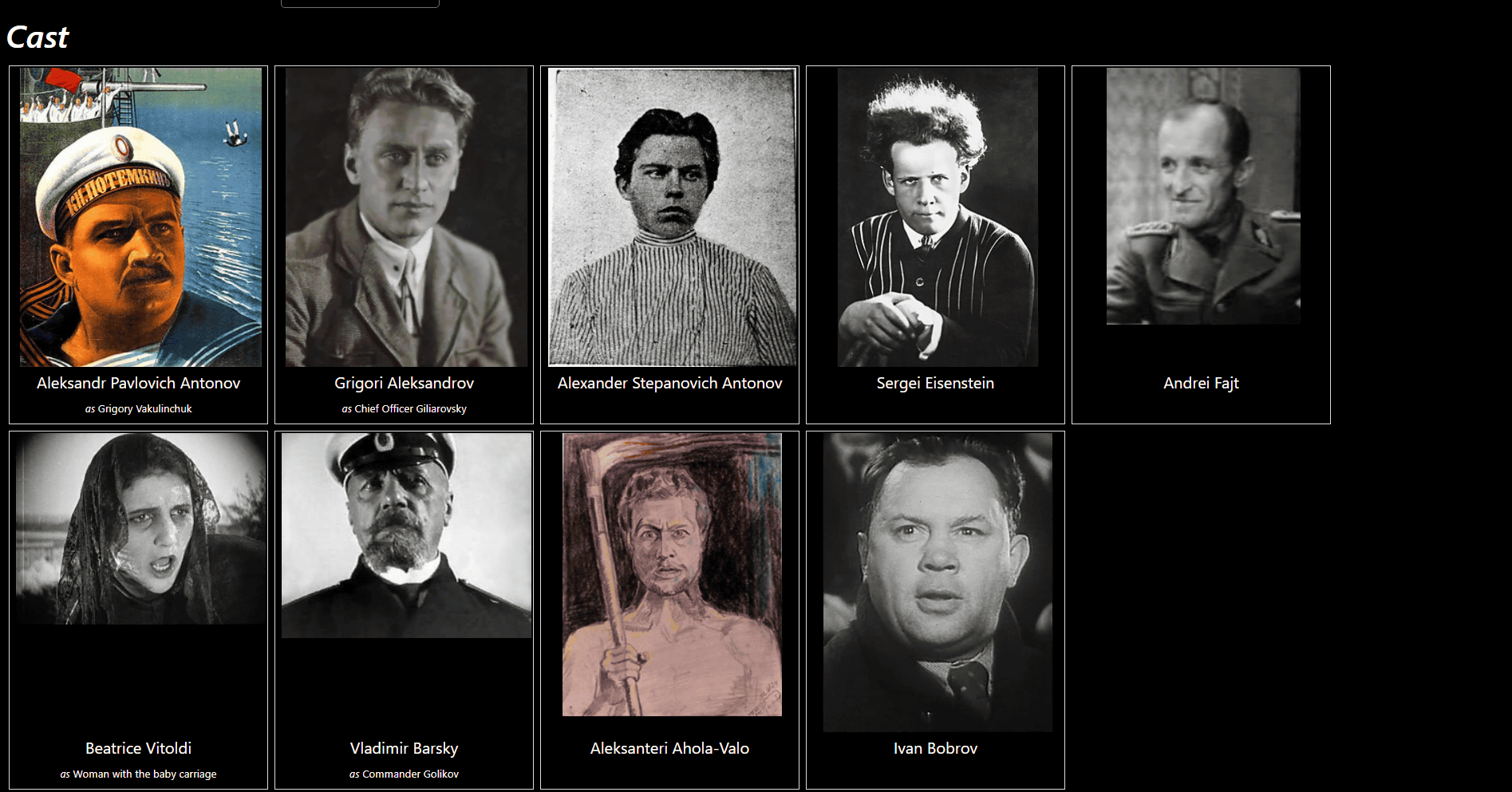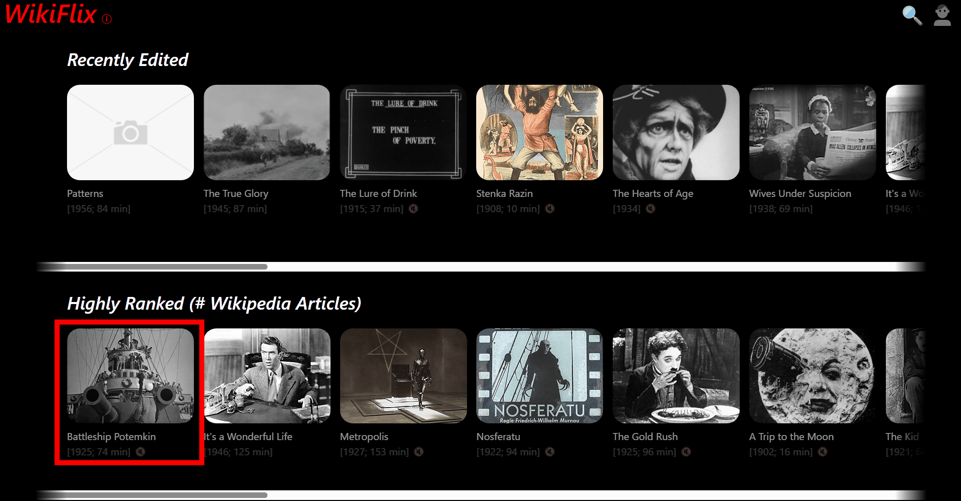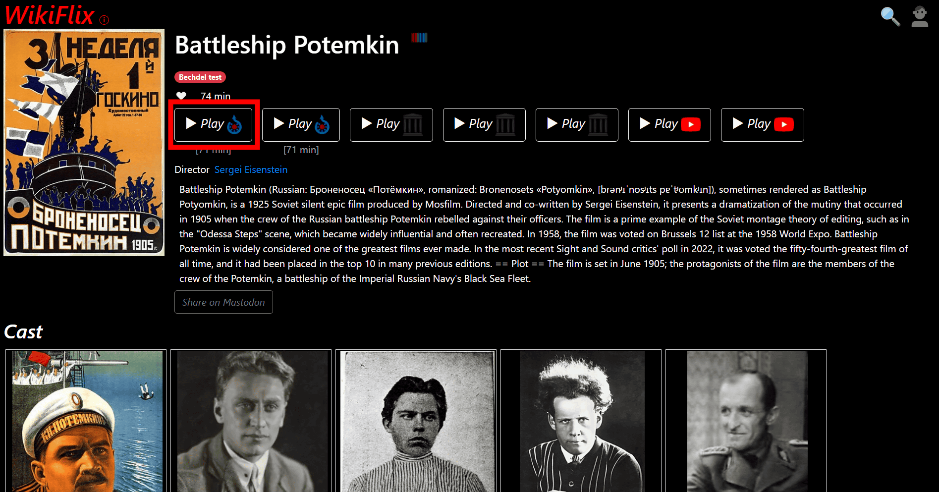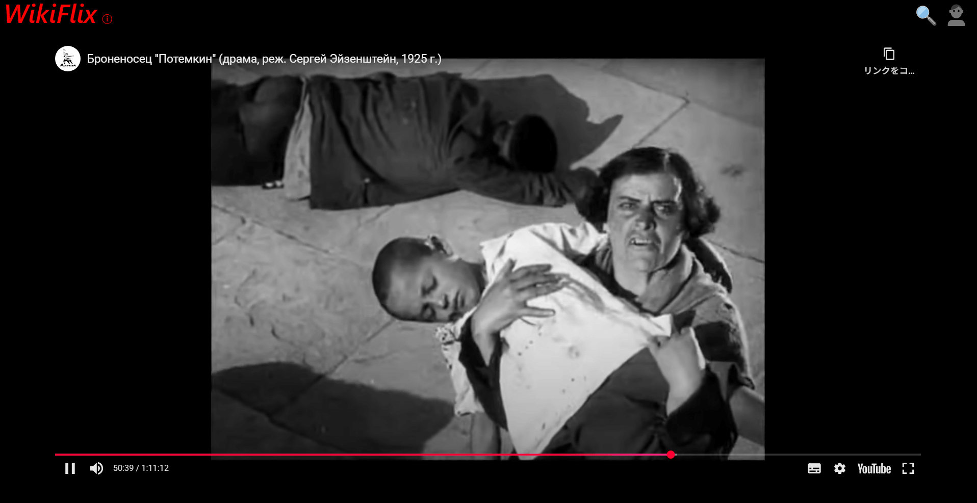 WikiFlixにアクセスするとこんな感じで、ウィキメディア・コモンズ、インターネット・アーカイブ、YouTubeにパブリックドメインとして公開されている映画のタイトルとサムネイルが並んでいます。今回は「Highly Ranked(# Wikipedia Article)」の欄に表示されていた「Battleship Potemkin(戦艦ポチョムキン)」のサムネイルをクリックしてみました。