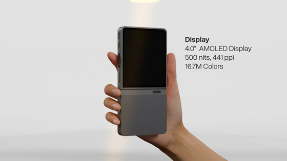 Mecha Cometの外観やサイズ感は以下の通り。高さ155mm×幅73mm×厚さ14mmで重量は225g。ディスプレイは4.0 AMOLED Display(有機EL)を採用しており、輝度は屋外でも比較的見やすいレベルの「500ニト」、画面密度はハイエンドスマホ級となる「441ppi」、表示できる色数は「1670万色」と高精度になっています。