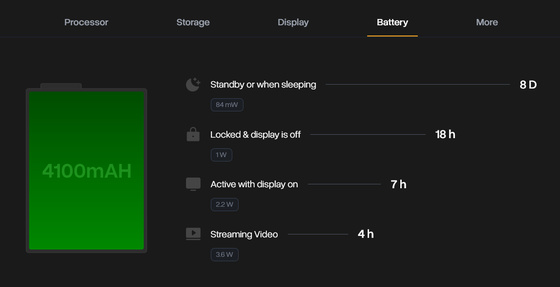 バッテリーは4100mAhで、満充電からの持続時間はスタンバイ時またはスリープ時に8日、ディスプレイオフの状態で連続稼働18時間、ディスプレイオンの状態で7時間、映像コンテンツのストリーミングを連続再生した場合は4時間とのこと。