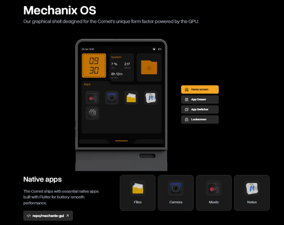その他、オペレーティングシステムは独自のフォームファクター向けに設計された「Mechanix OS(Linux 6.12)」を搭載。ネイティブアプリとしてファイルやカメラ、音楽、ノートといった必須のアプリが付属しています。カメラはオートフォーカス付きの8MPカメラ1個で、オーディオはデジタルマイク2個とHDスピーカーがあります。ポートはHDMIポートが1個、USB-Cポートが2個となっています。