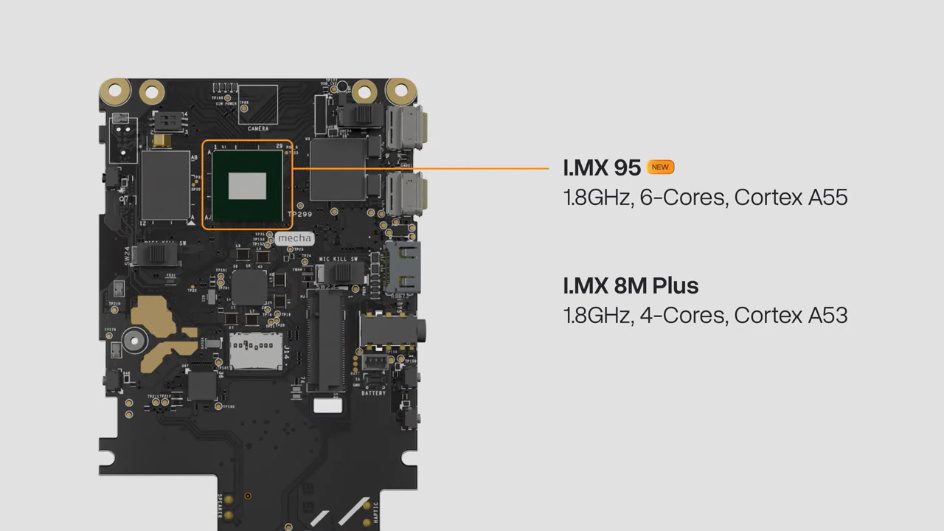 Mecha Cometのプロセッサは「i.MX 95(1.8GHz、6コア、CortexA55)」もしくは「i.MX 8M(1.8GHz、4コア、CortexA53)」。メモリは「2GB」「4GB」「8GB」で、ストレージは「64GB」「128GB」から選択できます。
