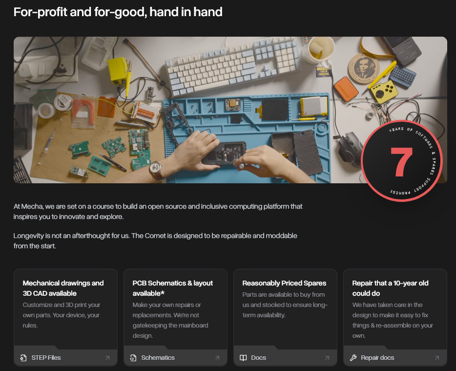 サイトによると「Mecha Cometは革新と探求を促すオープンソースの包括的なコンピューティングプラットフォームの構築を目指しています」とのことで、改造や修理が行いやすいように設計されています。スペアパーツや修理方法のドキュメントが詳細に公開されており、「10歳の子どもでもできる修理」とプロジェクトチームは述べています。