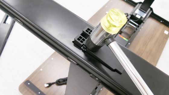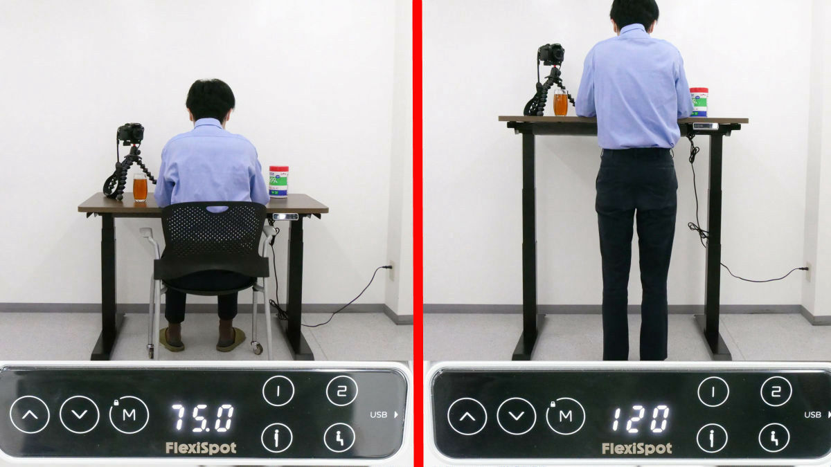 お茶の入ったグラスに注目して、デスクの高さを120cmから75cmに下げ、再び120cmに上げて液面の揺れを観察してみた動画が以下。デスクを昇降させてもほとんど液面が揺れることはなく、非常に安定していることがわかります。