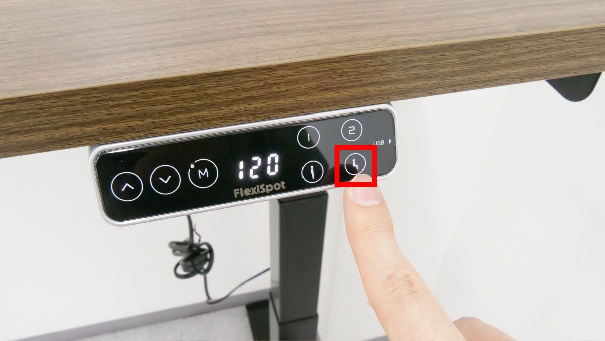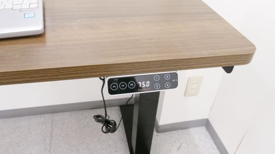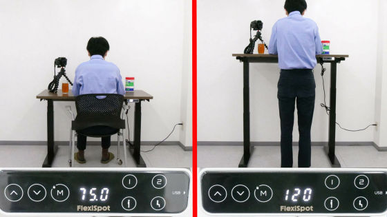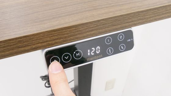 続いて「位置記憶ボタン1」「位置記憶ボタン2」「立ち位置記憶ボタン」「座り位置記憶ボタン」のいずれかを押すと、現在の高さがそのボタンに割り当てられ、次にそのボタンを押すと自動で記憶した高さにしてくれるというわけです。今回は試しに「立ち位置記憶ボタン」に「120cm」を、「座り位置記憶ボタン」に「75cm」を記憶させてみました。