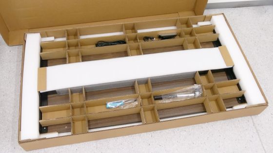 その下に組み立て用の部品が付いた天板がありました。今回組み立てるのは一番人気だというグレーウッド天板+ブラックフレームで、天板サイズは120cm×60cm×2.5cmです。床がフローリングなどの傷つきやすい材質の場合は、組み立ての際に傷つけないようにカーペットや保護用のシートを敷くといいかもしれません。