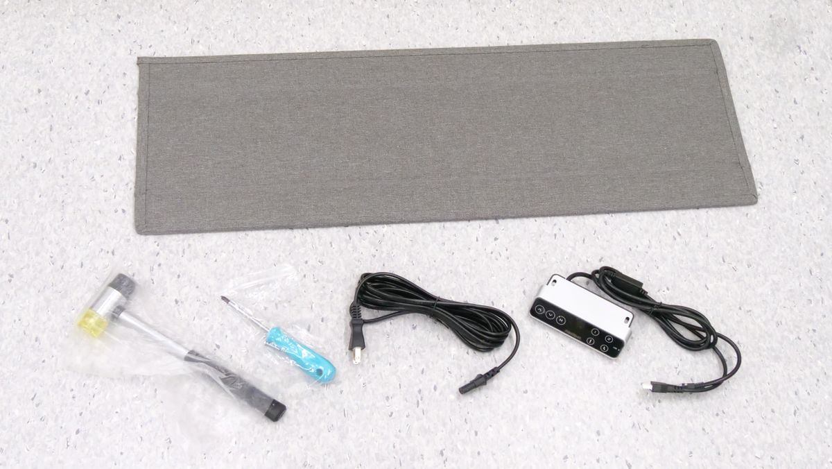 中に入っていたのは「E7 Click」のケーブルカバー、ゴム製ハンマー、ドライバー、ビス×2本、電源コード、コントローラーといった小物類。