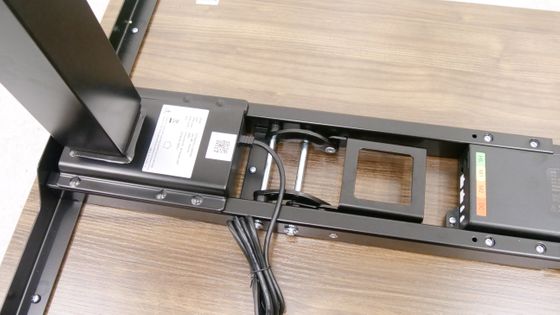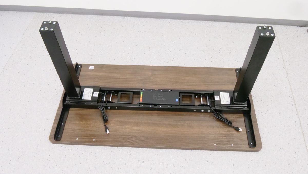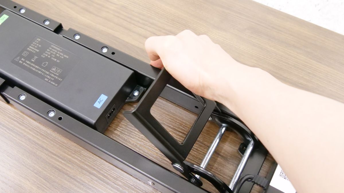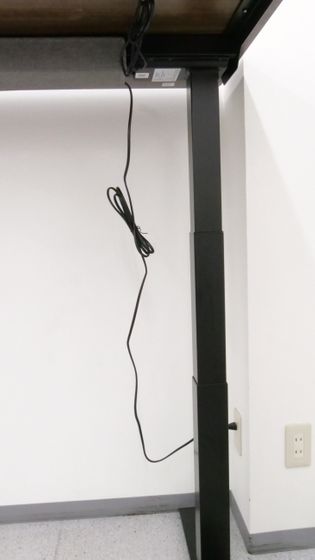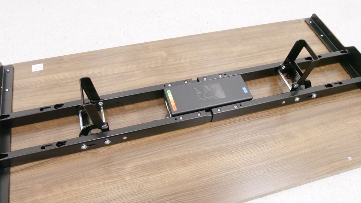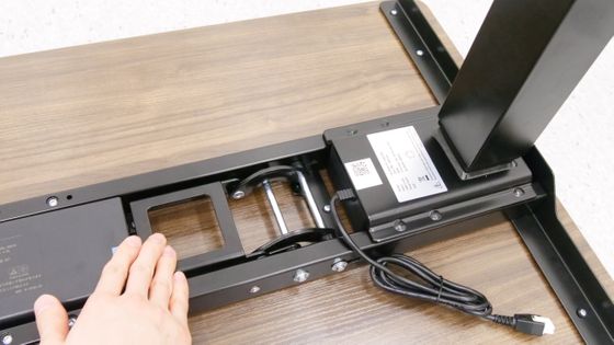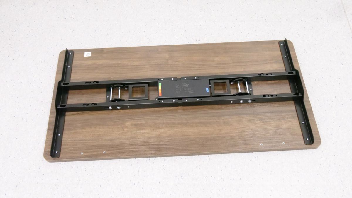 完成したスタンディングデスクをひっくり返すとこんな感じ。なお、合計重量は50kg以上あるため、力に自信がある成人男性であれば1人でもひっくり返すことは不可能ではありませんが、複数人で協力してひっくり返した方が安全です。使いやすい場所に移動させて、電源ケーブルをコンセントに接続すればすぐに使い始められます。
