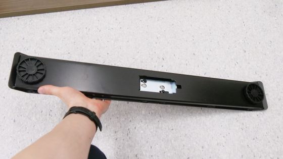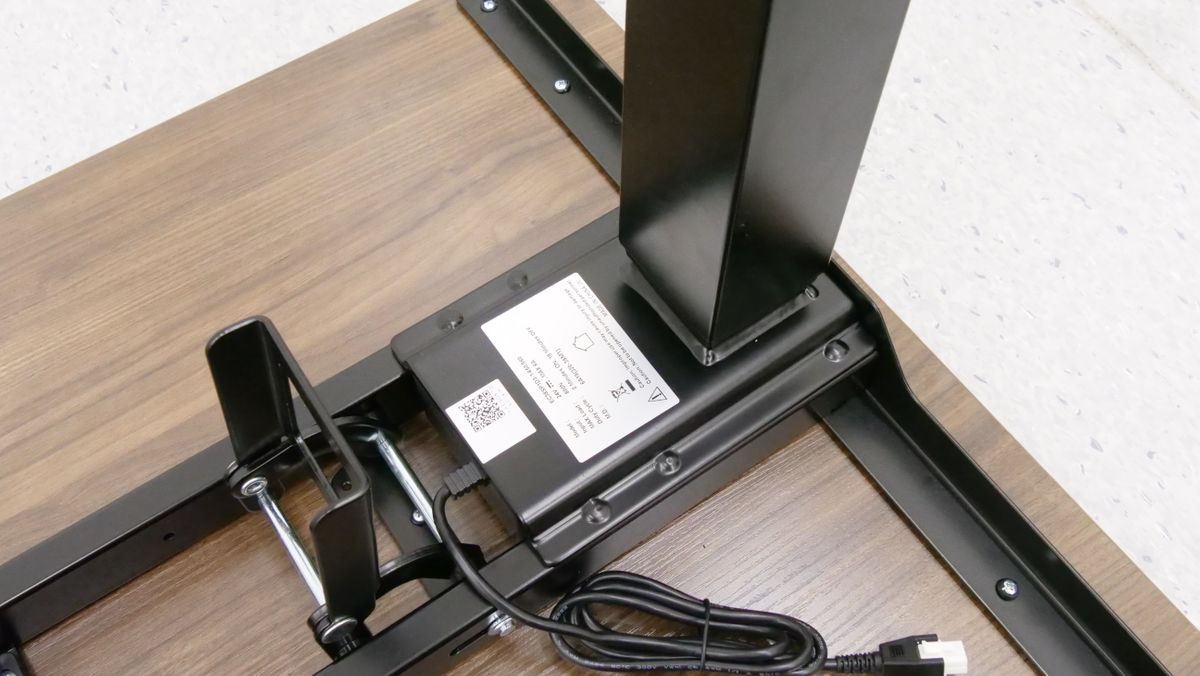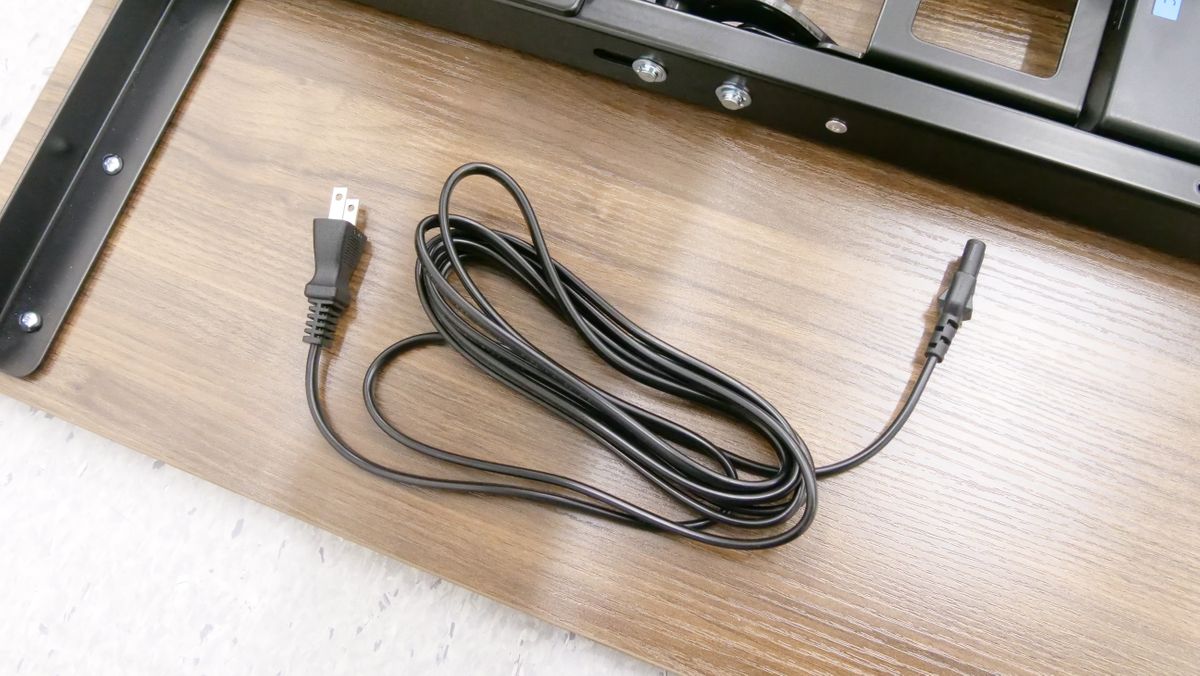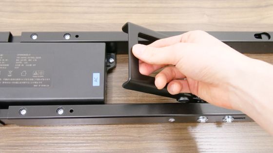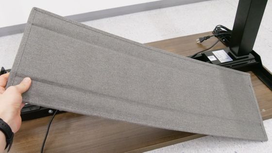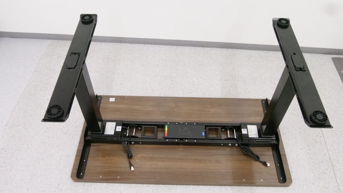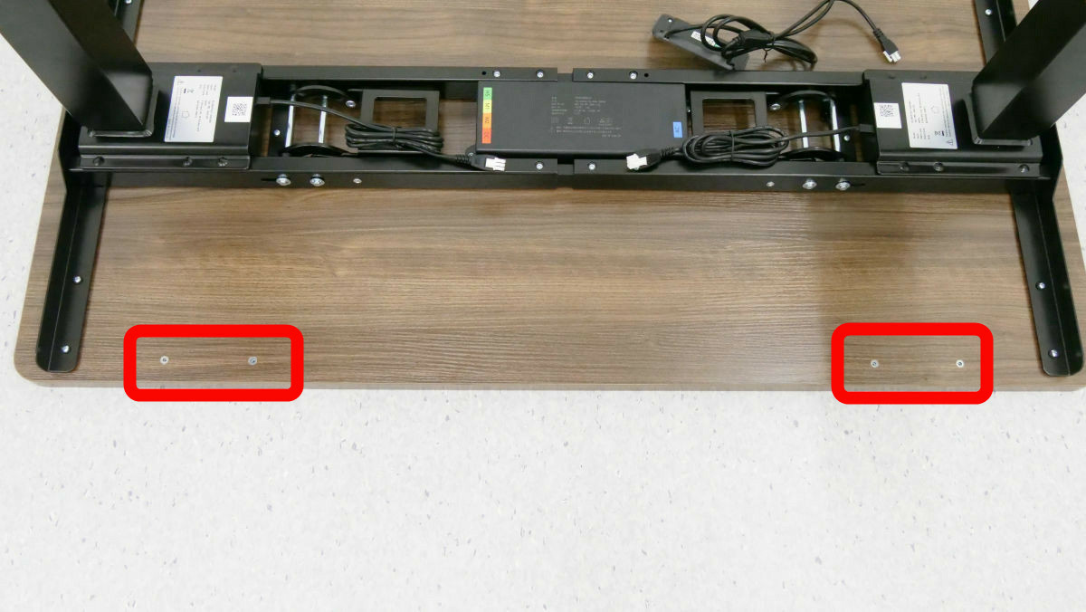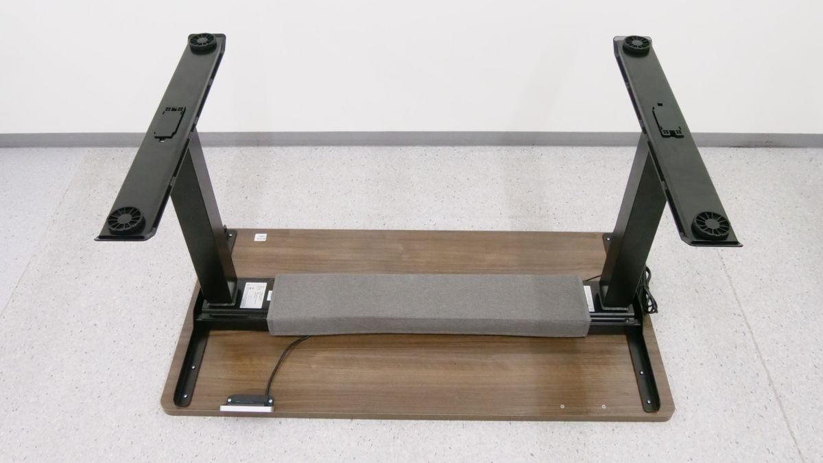 完成したスタンディングデスクをひっくり返すとこんな感じ。なお、合計重量は50kg以上あるため、力に自信がある成人男性であれば1人でもひっくり返すことは不可能ではありませんが、複数人で協力してひっくり返した方が安全です。使いやすい場所に移動させて、電源ケーブルをコンセントに接続すればすぐに使い始められます。