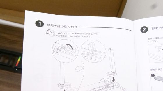 中には机の脚×2本、取扱説明書、脚の留め具×2個、昇降支柱×2本が入っていました。
