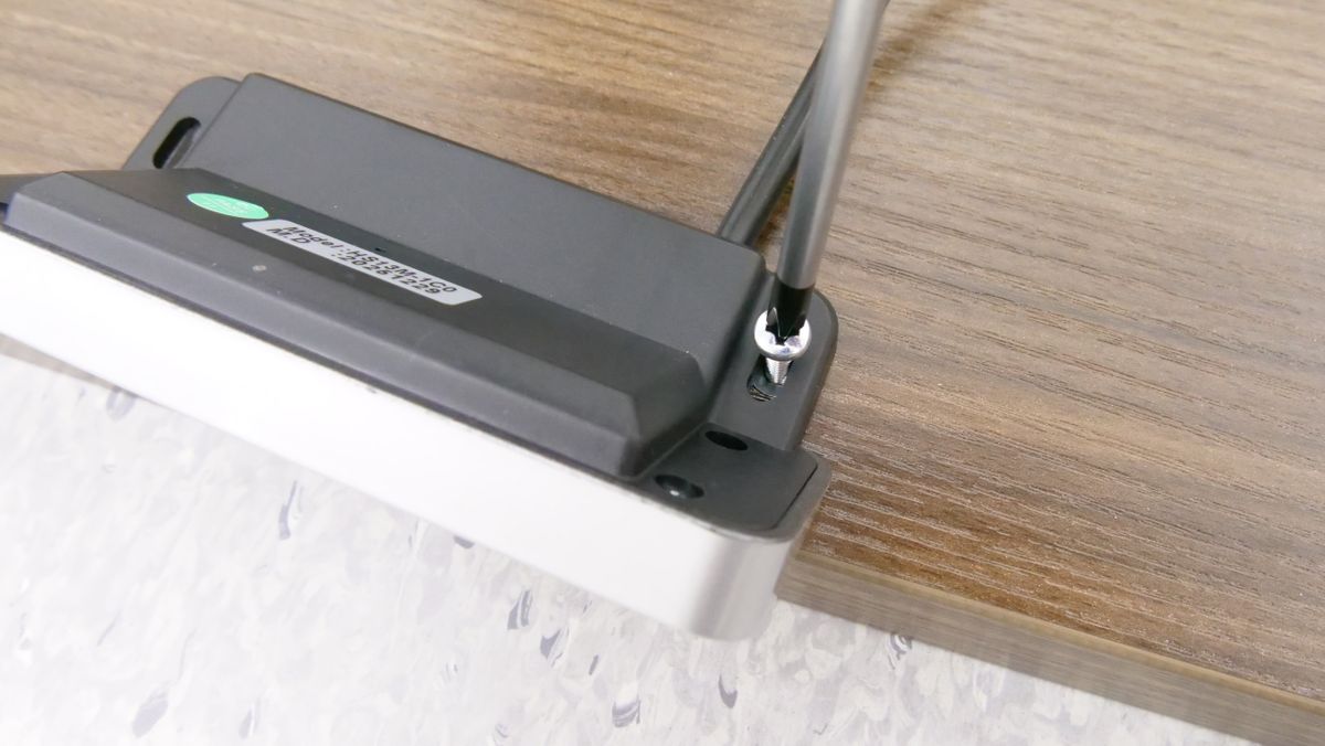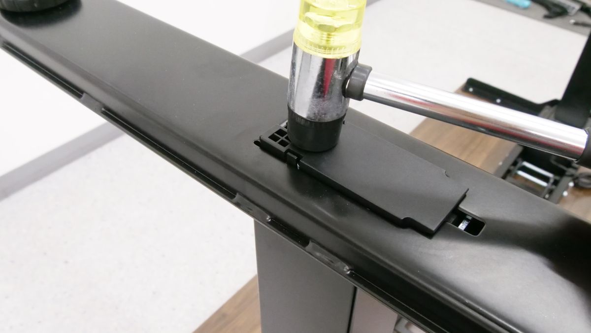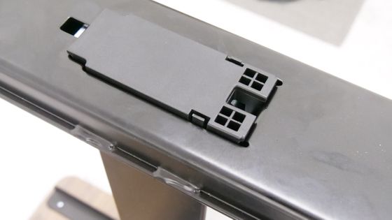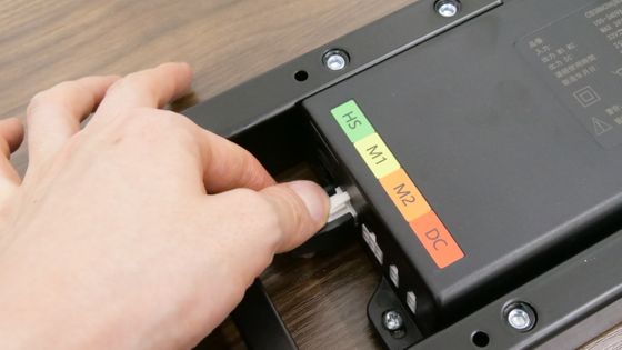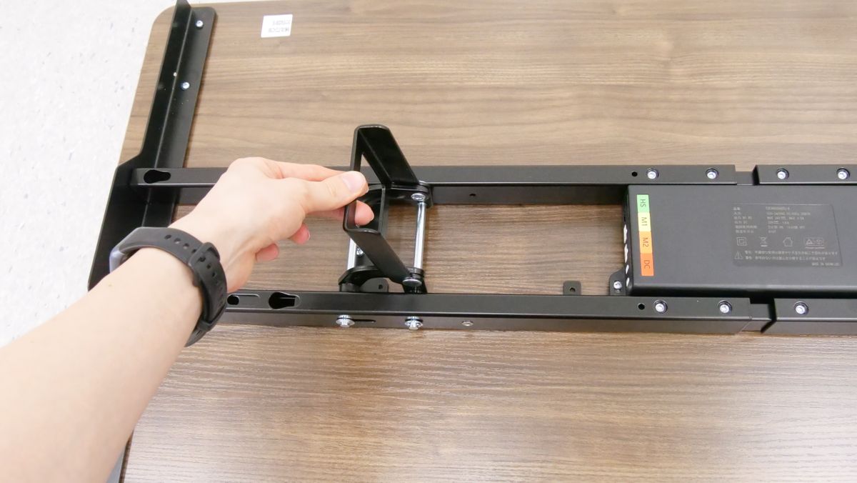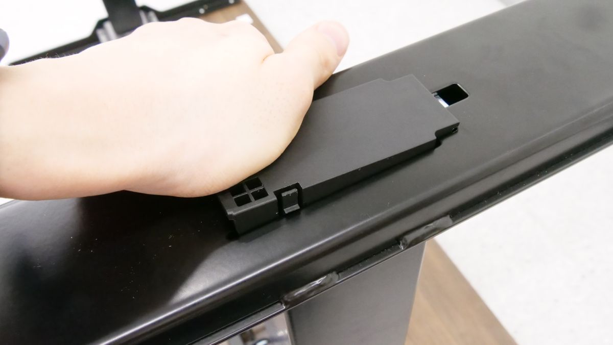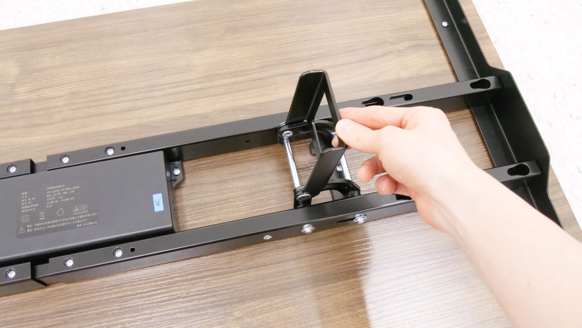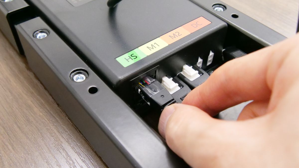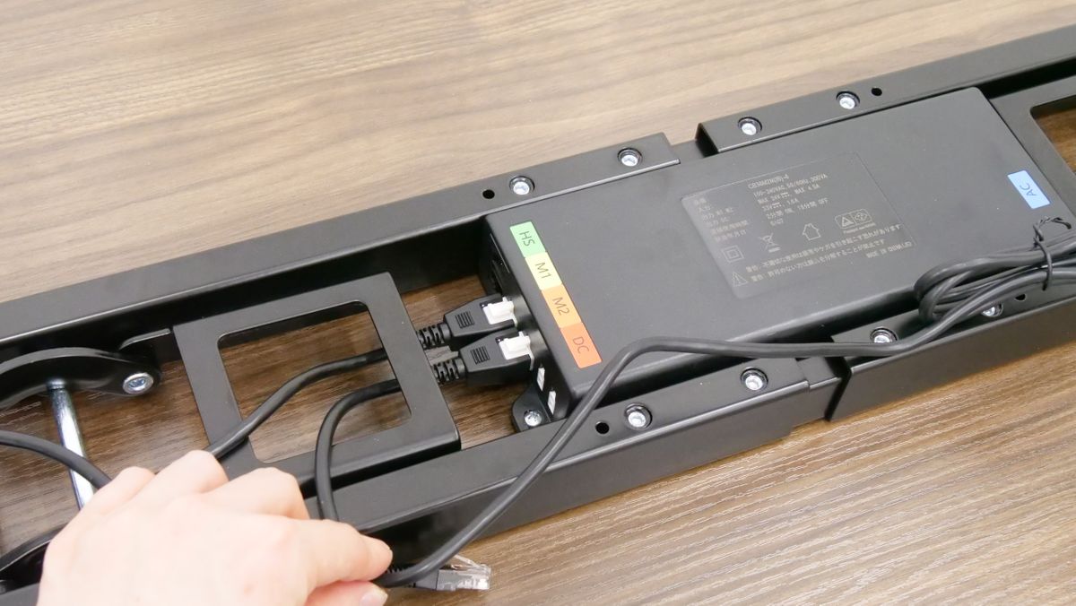 天板の裏にあるビーム中央部に接続端子があります。昇降支柱の端子は「M1」あるいは「M2」と記されている特徴的なポートに差し込めばOK。今回は「M1」に差し込みました。