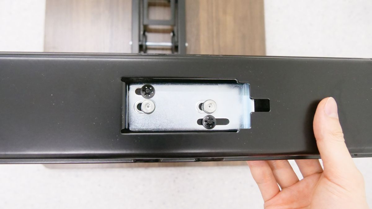 このボルトを脚の中央にある取り付け穴に差し込みます。なお、取り付け穴が隠れている場合は金属のプレートを指でずらし、ボルトが通るだけの間隔を空けておく必要があります。